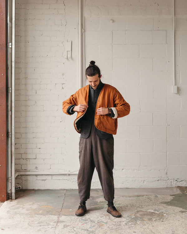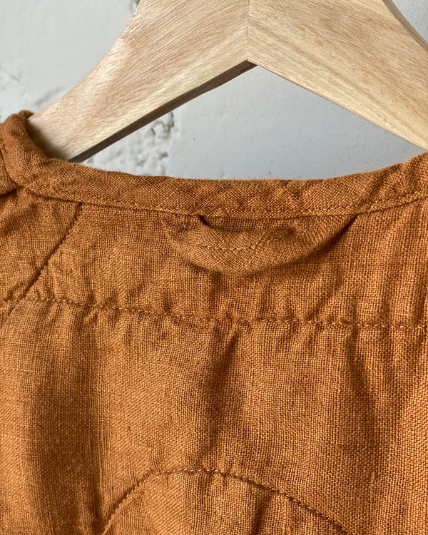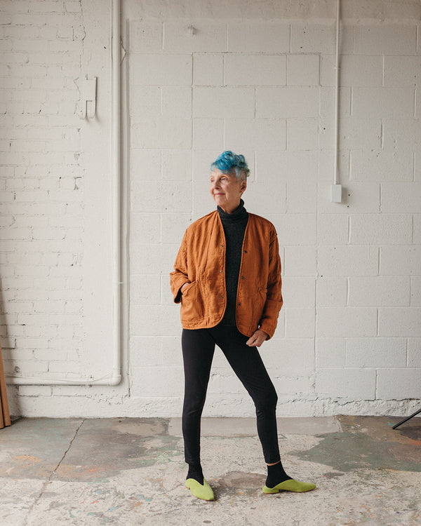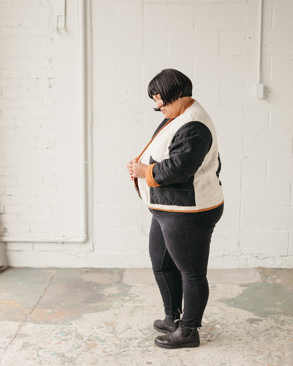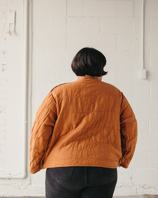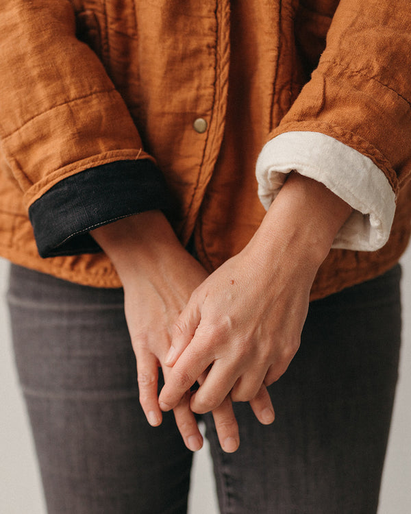 The coat features a generously versatile fit with two large pockets, a rust-colored reverse side, and bound seams throughout. It hits at the waistline with the perfect lightweight drape, thanks to the bamboo blend batting we used as fill. It has a 3-snap closure, and is easy to wear with layers or on its own. It is just like wearing the softest linen quilt!