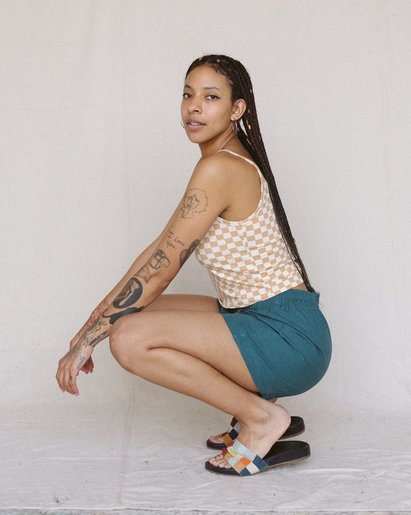 Your favorite Easy Sailor Pants got a summer cut. These linen shorts are the perfect length for doing all the activities. Or no activities. Either way, they'll quickly become the shorts that you grab for when you want to feel comfy. The 2" sewn-through elastic waistband ensures they'll stay where they need to. They are fitted at the waist and hips but still have a couple large pockets to fit some essentials.