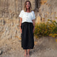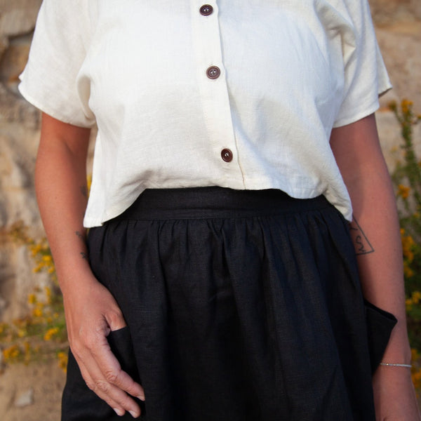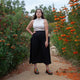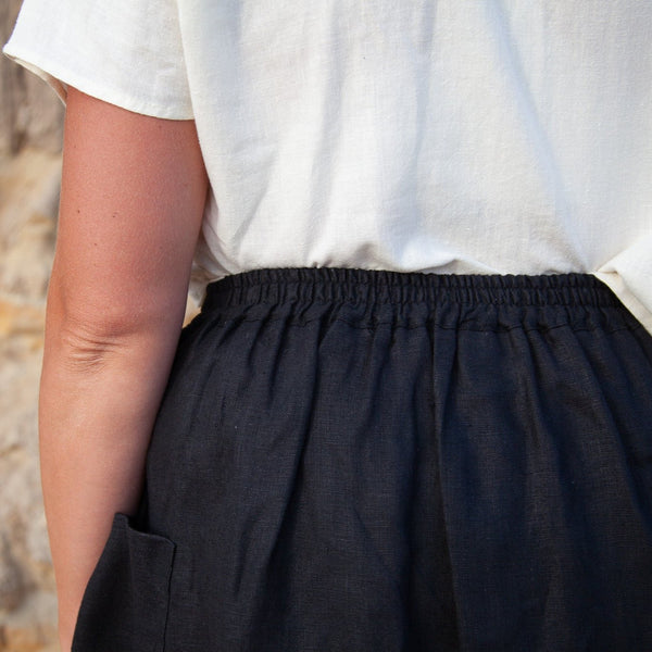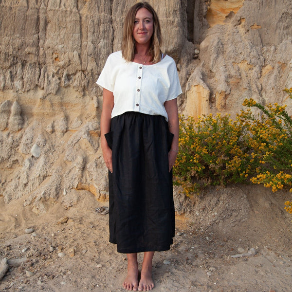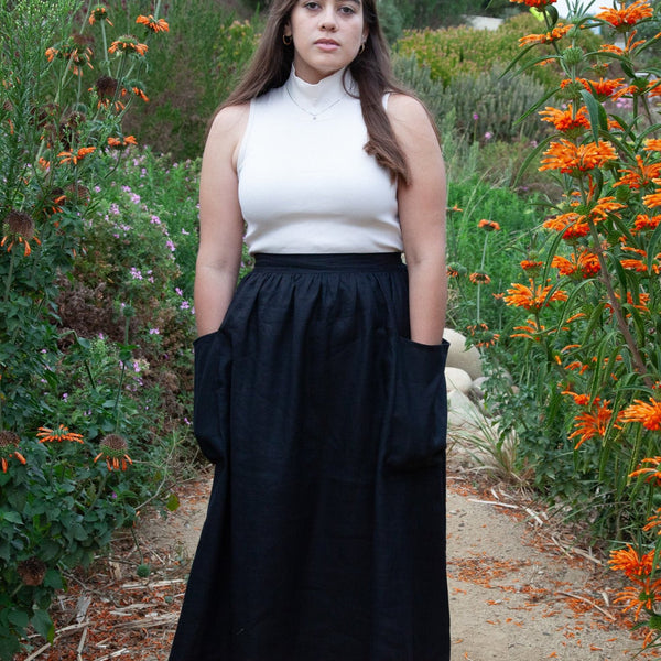 The Flora Skirt is the perfect all-season natural fiber piece. Made with 100% linen it is easy for warm weather but also perfect for layering during the colder months. You know we love pockets and this design does not disappoint! Two oversized side pockets (that are fully functional and won't drag your skirt down!) and a flat front waistband are our favorite features on this piece. The elasticated back gives flexibility while the flat front waistband avoids that feeling of elastic cutting into you while also creating a more tailored look. We love pairing this with our Crop Top!
