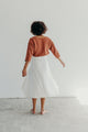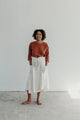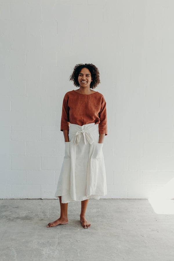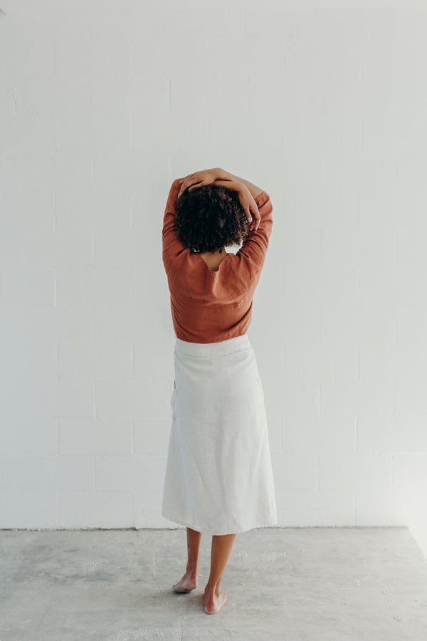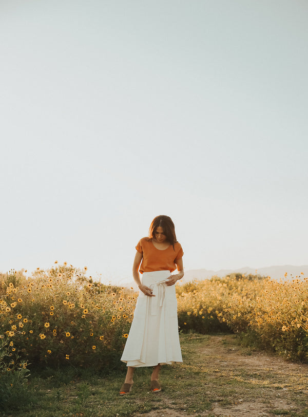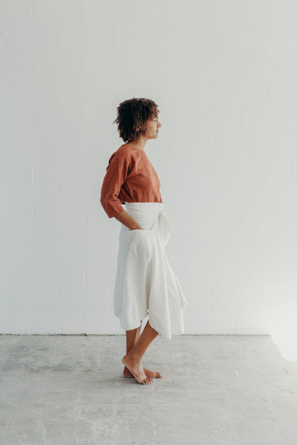 Our signature Wrap Pants got dressier. Ok, skirt-ier? This skirt is a statement piece and so comfortable and flattering on many shapes and sizes. The wide waistband and two oversized pockets makes it practical and so easy to wear. Tie it high on your natural waist for a midi look or on the hips for more of a maxi look. The design allows for fluid sizing and fluctuating bodies.