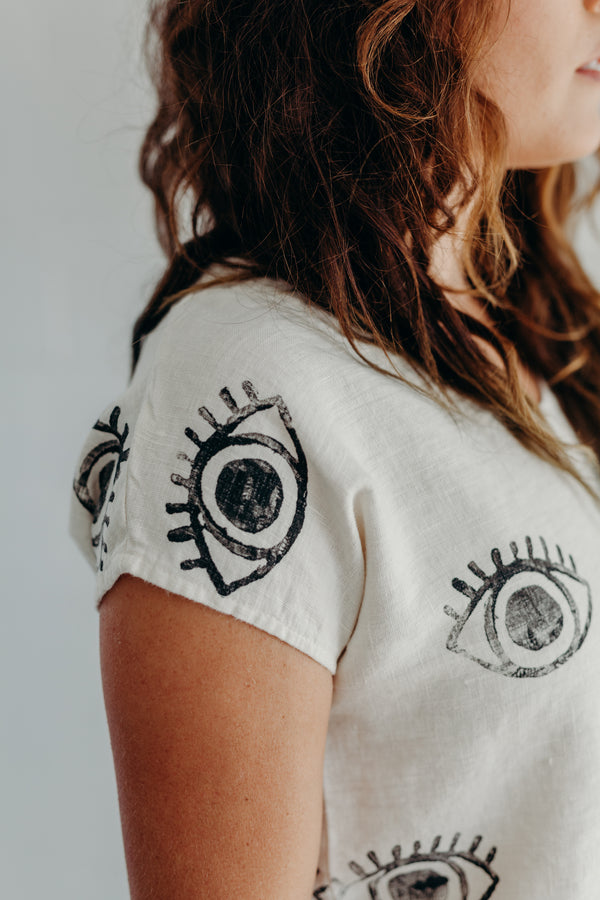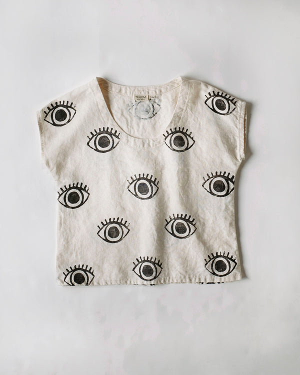 EYE see you! Ok, ok, cut the dad jokes. This shirt is bound to be a classic, made out of 7 oz 100% linen, making it super durable, soft, and easy to wash. Slightly cropped to sit at your belt line with a boxy shape that drapes beautifully on many shapes. Original block print by Summer Dalton, each one is printed by hand using permanent water-based inks. Each shirt will vary slightly due to the hand-printing.